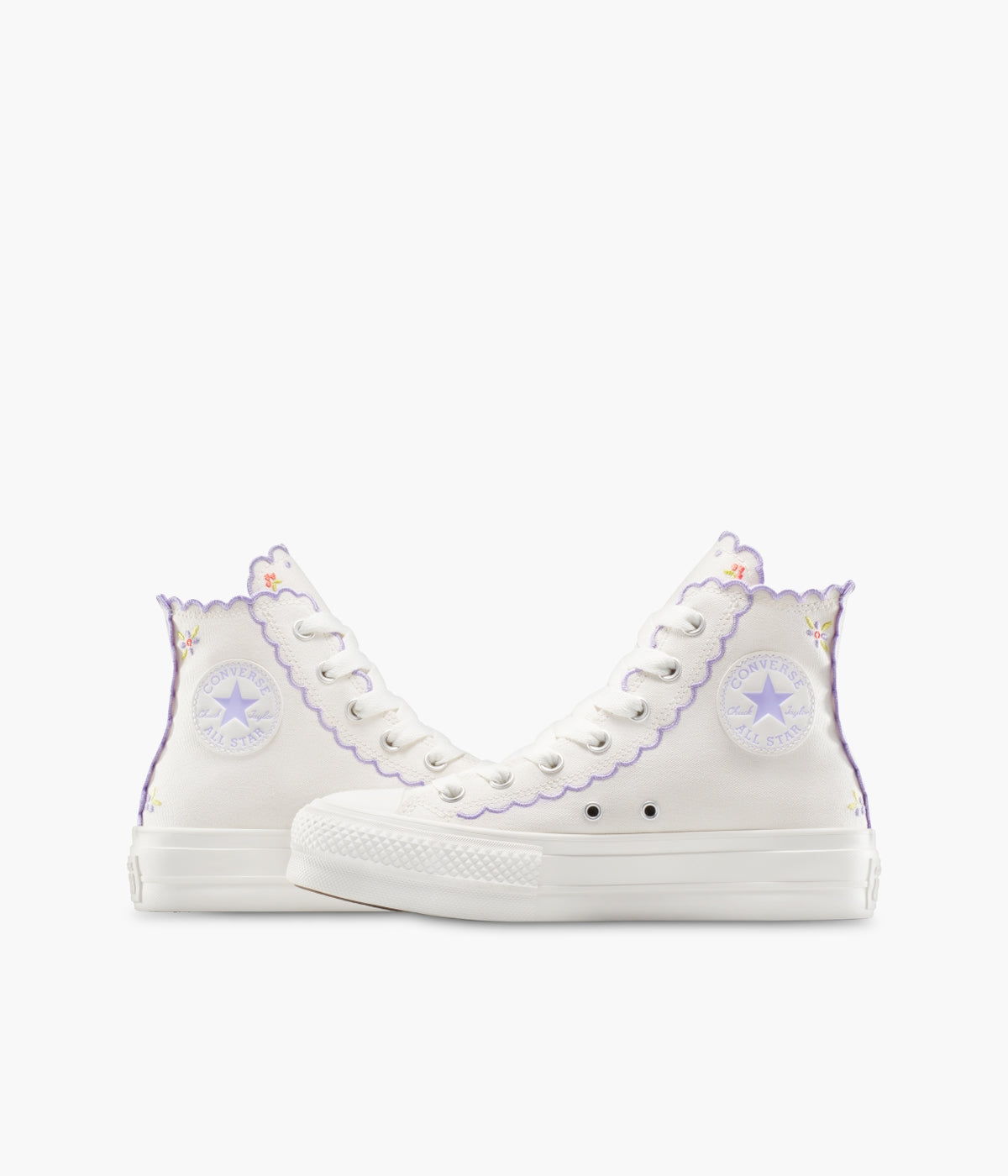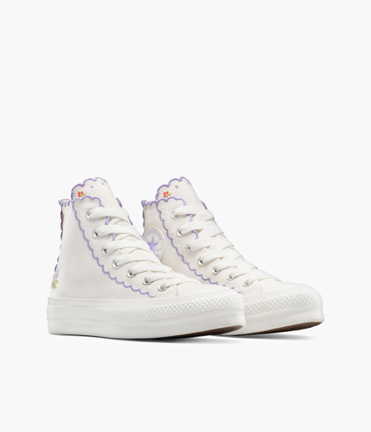 Step up your style with the Converse Women's Chuck Taylor All Star Lift Platform Embroidered Flowers High Top. Featuring a durable canvas upper and signature Chuck Taylor details, these sneakers combine classic appeal with modern flair. The elevated platform adds height while OrthoLite cushioning ensures all-day comfort. Delicate embroidered scalloping and floral accents bring a unique, crafted touch to this iconic design, making it the perfect statement piece for any wardrobe.