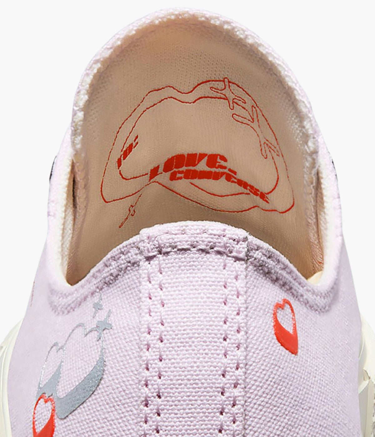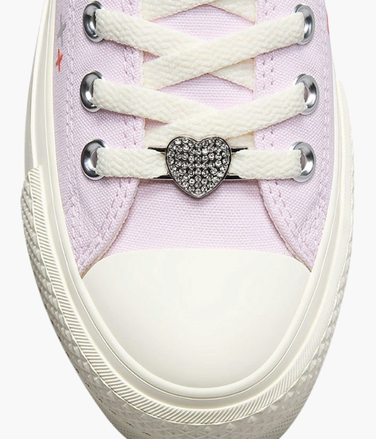 Embrace those early-aughts vibes with these lifted Chucks! Decked out with tiny hearts, metallic accents, and rhinestone details, these sneakers are a total throwback to Y2K style. Built with durable canvas for that classic Chucks feel and OrthoLite cushioning for all-day comfort. Red silicone hearts and silver metallic ink add a touch of 2000s flair, while a rhinestone top eyelet and laces complete the look. A small heart inside adds a hidden touch of personality. Show off your unique style – grab your pair today!