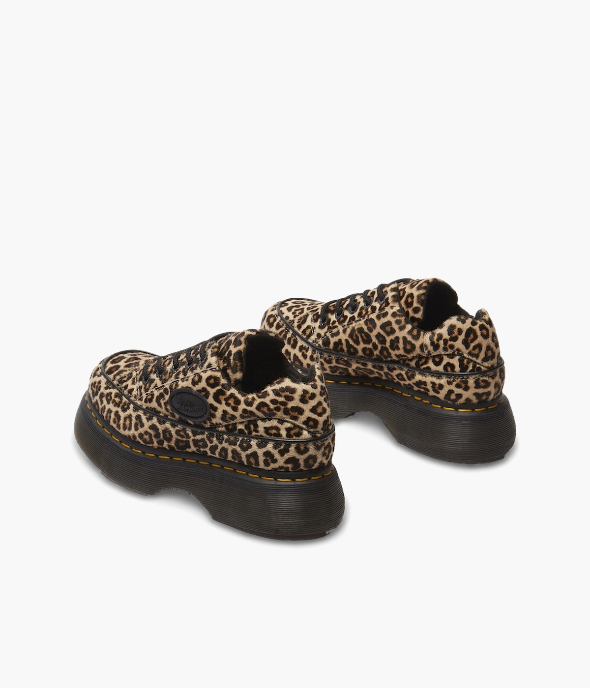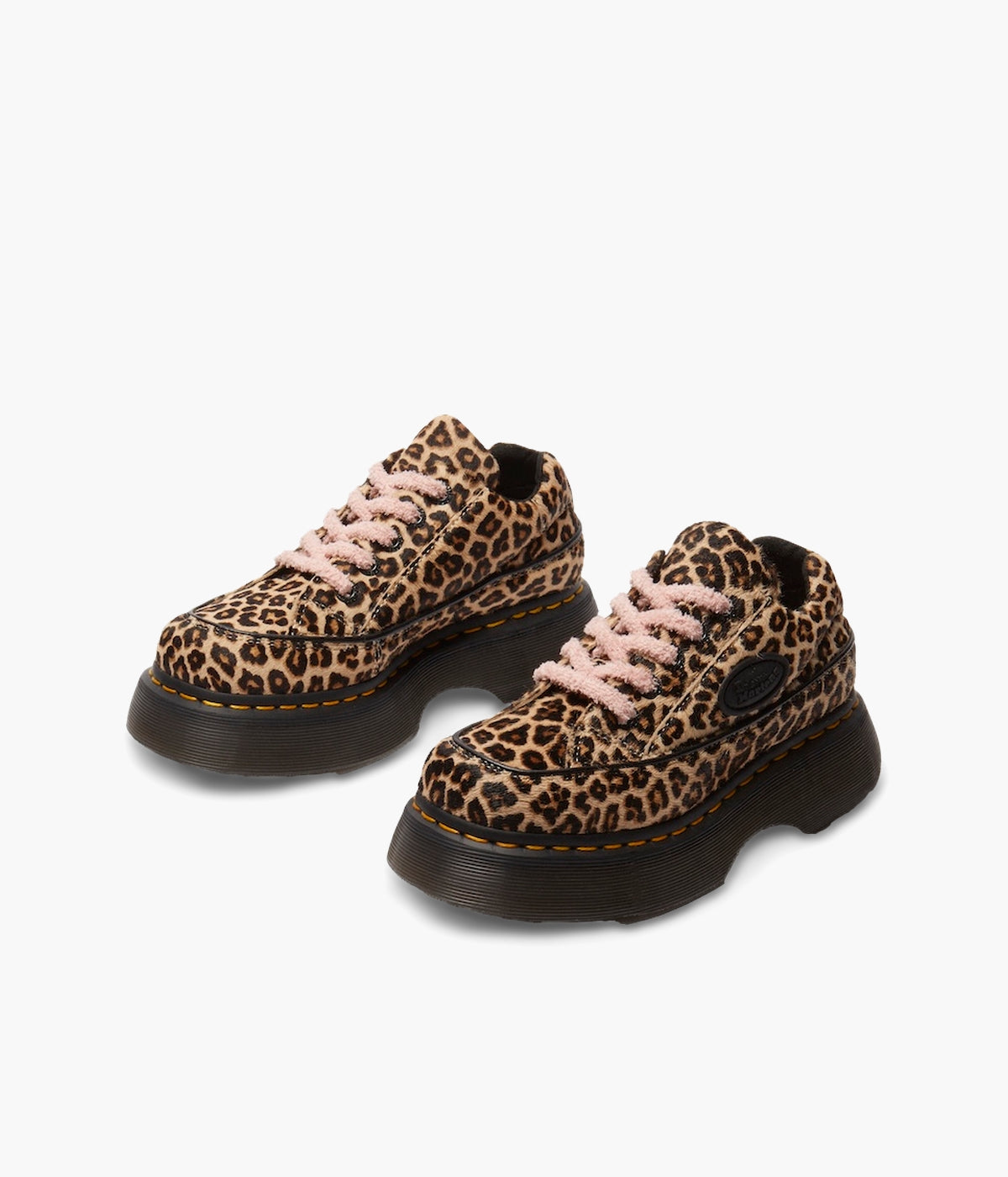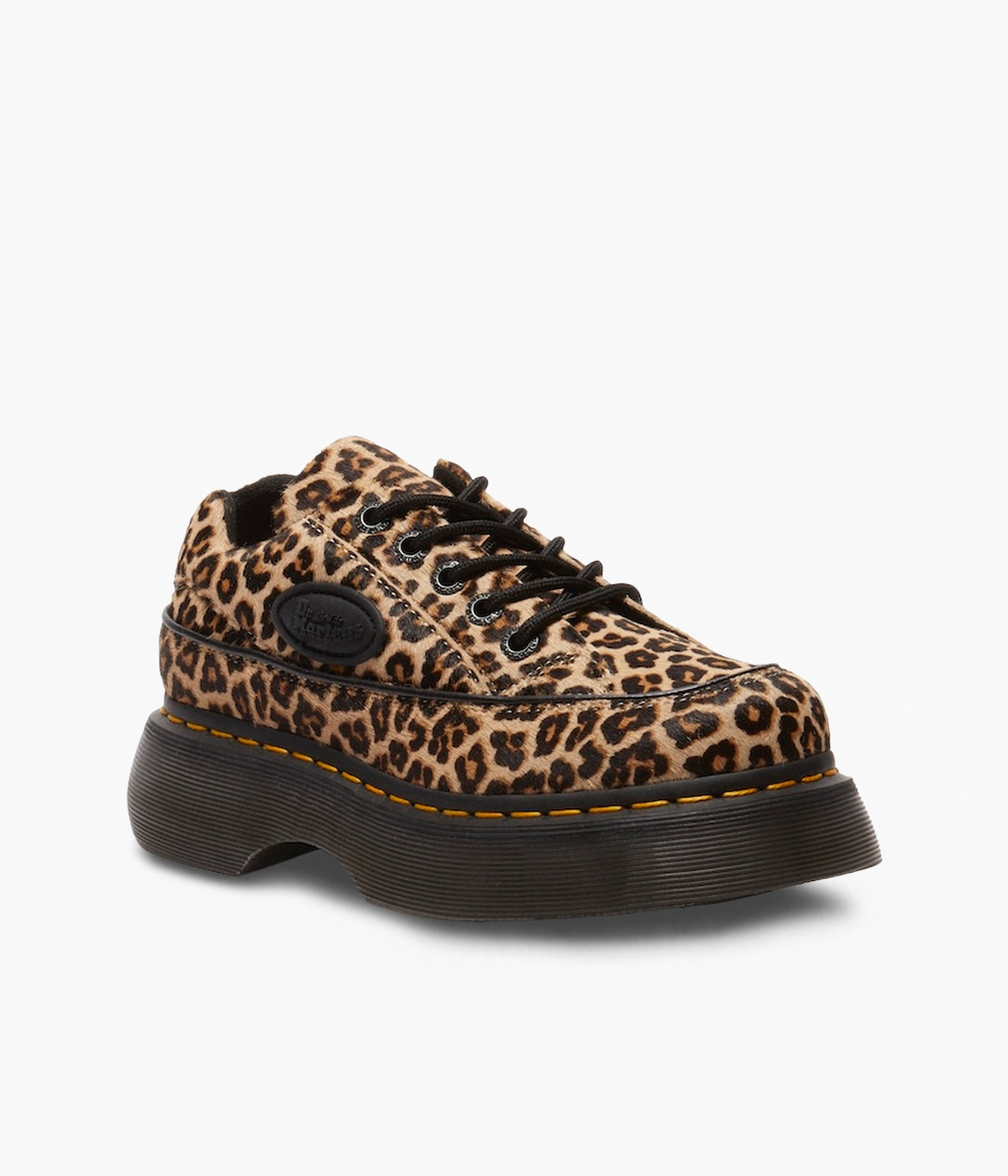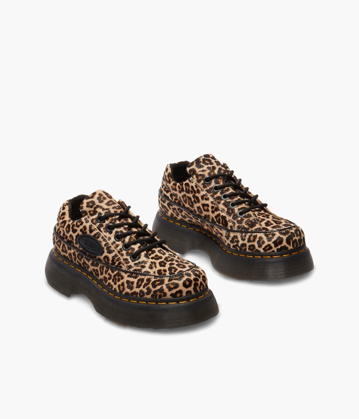 Make a statement with the Dr. Martens Buzz 5-eye leopard shoes. Inspired by '90s fashion, these shoes boast a head-turning design from the chunky, barrel-edge Buzz sole to the bold leopard print. Crafted from genuine Hair-On cow leather, the Buzz 5-eye features DM's signature grooving, black welt stitching, and a leaf pattern on the undersole. The padded collar ensures comfort while the Goodyear welt construction guarantees long-lasting durability. An inflated, rubberized badge mirrors the sole, adding a unique touch. Step into style and turn heads with these iconic Dr. Martens.