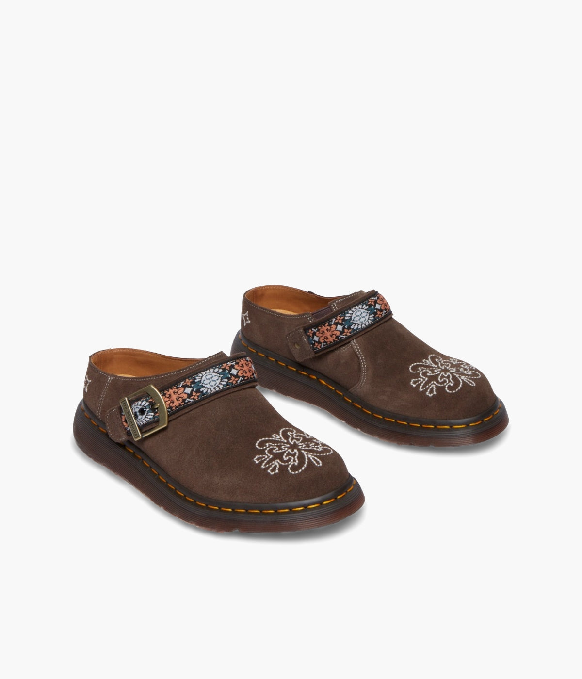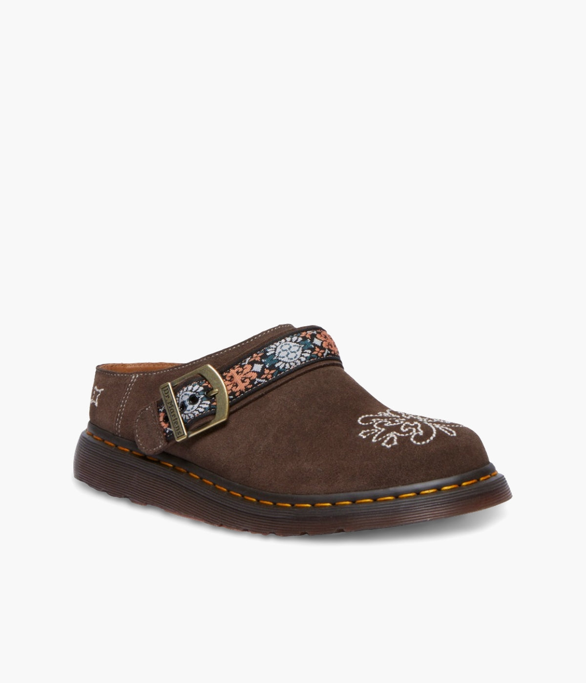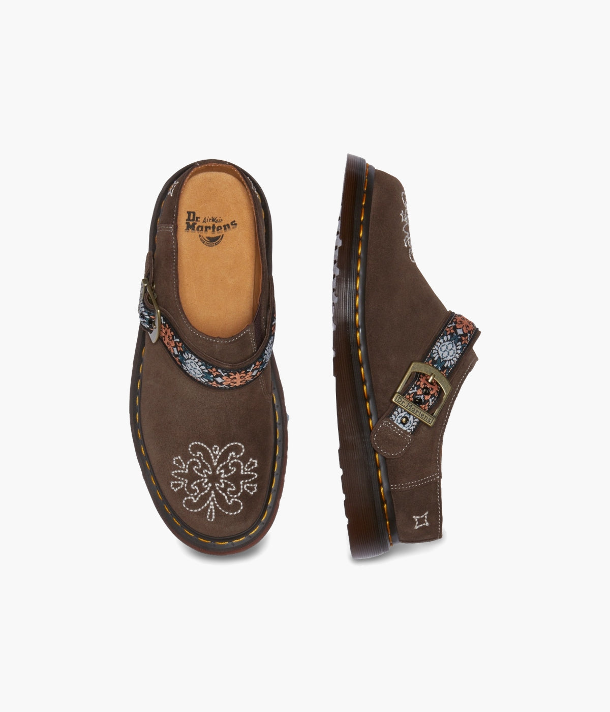 Effortless style meets easy comfort with the Dr. Martens Isham Suede and Jacquard Mules. Crafted from soft yet durable Plush Suede Reverse textured leather, these mules offer a luxurious feel with lasting wear. The adjustable jacquard strap provides a personalized fit, while the embroidered designs on the heel and toe add a touch of unique Dr. Martens flair. Set on a retro trans Shore outsole and finished with the iconic yellow welt stitch, these mules are a stylish and comfortable choice for everyday wear. Upgrade your wardrobe today!