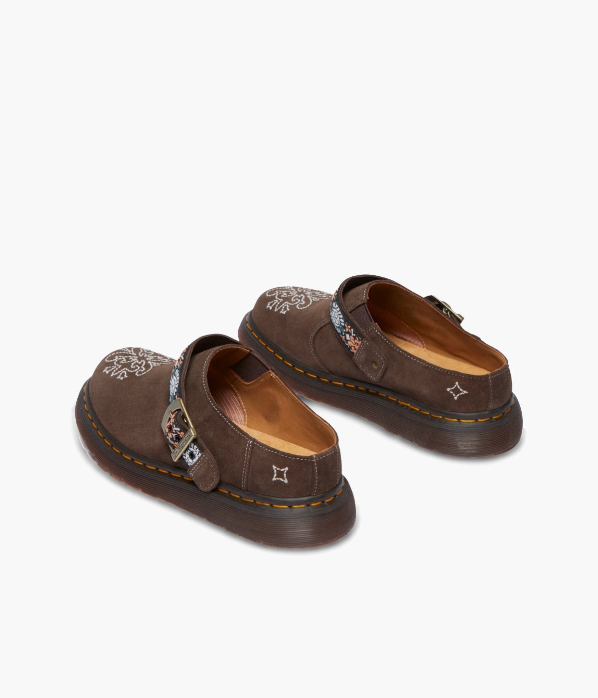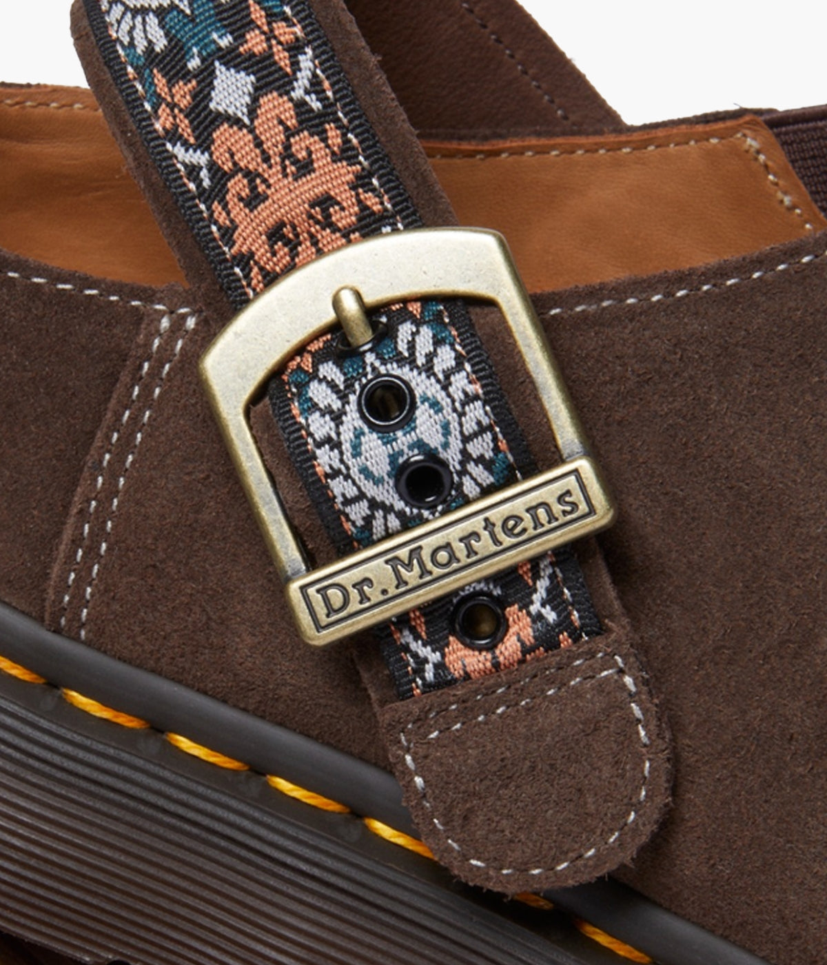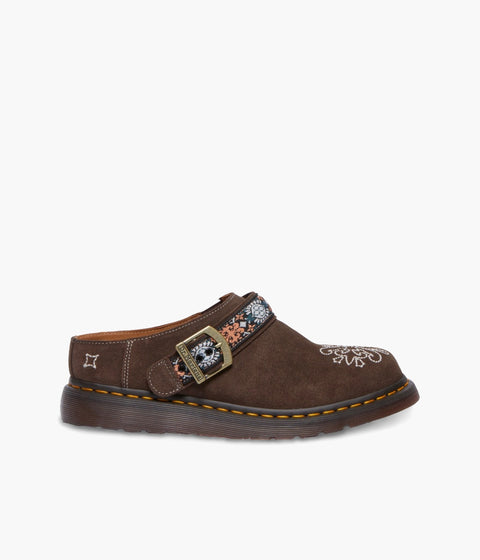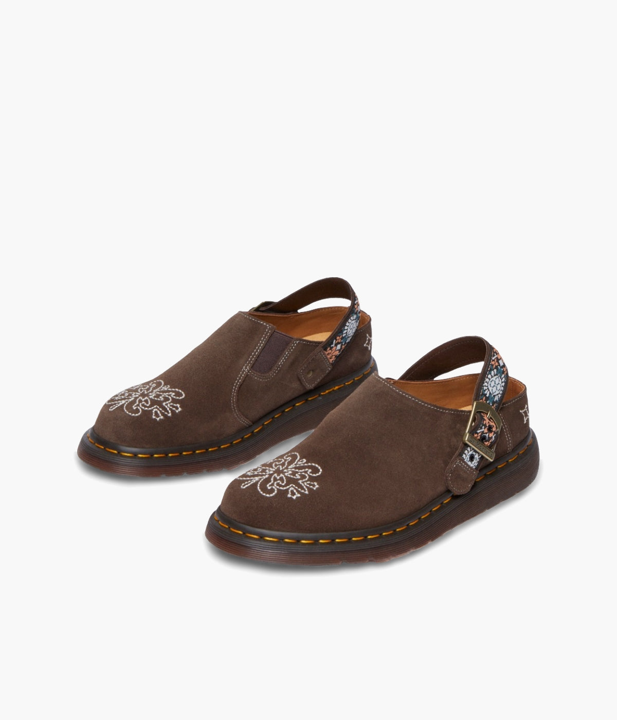 Effortless style meets easy comfort with the Dr. Martens Isham Suede and Jacquard Mules. Crafted from soft yet durable Plush Suede Reverse textured leather, these mules offer a luxurious feel with lasting wear. The adjustable jacquard strap provides a personalized fit, while the embroidered designs on the heel and toe add a touch of unique Dr. Martens flair. Set on a retro trans Shore outsole and finished with the iconic yellow welt stitch, these mules are a stylish and comfortable choice for everyday wear. Upgrade your wardrobe today!