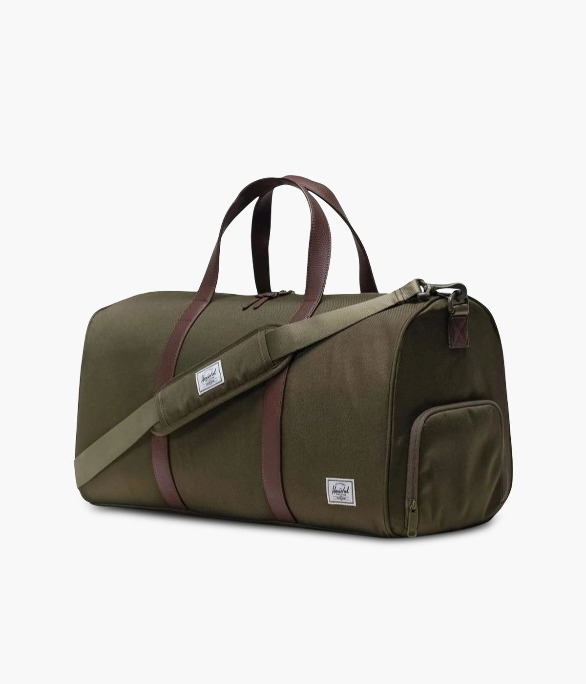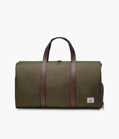 Introducing the Novel™ Duffle - 43L by Herschel: your perfect travel companion. Crafted from 100% recycled EcoSystem™ 600D fabric (made from post-consumer water bottles), this durable and sustainable duffle is ideal for road trips, weekend getaways, or everyday use. It's designed to fit perfectly in overhead bins or your car trunk. Enjoy convenient features like a waterproof zippered main compartment, a separate shoe compartment to keep your shoes away from your clothes, a side sleeve pocket for quick access, and comfortable vegan leather handles and a removable padded shoulder strap. Inside, you'll find a zippered mesh pocket for added organization. The tonal stripe EcoSystem™ liner adds a touch of style. Upgrade your travel game with the Novel™ Duffle and experience the perfect blend of sustainability, style, and functionality. Shop now and explore the world with Herschel.